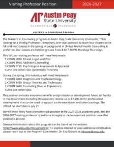 The Master’s in Counseling program at Austin Peay State University (Clarksville, TN) is