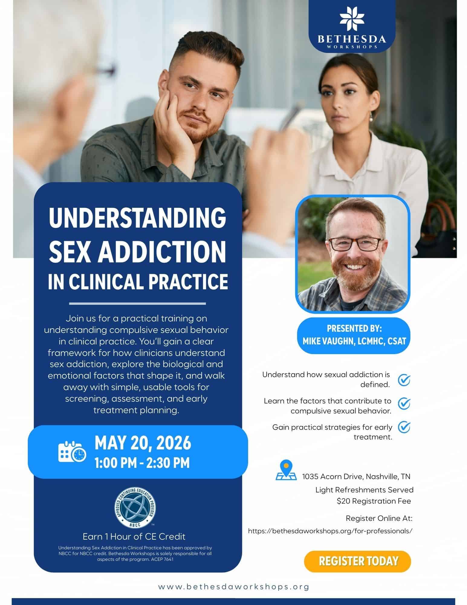 Clinicians will earn one hour of continuing education credit for this course through NBCC. They will gain a clear framework for how clinicians understand sex addiction, explore the biological and emotional factors that shape it, and walk away with simple, usable tools for screening, assessment, and early treatment planning.